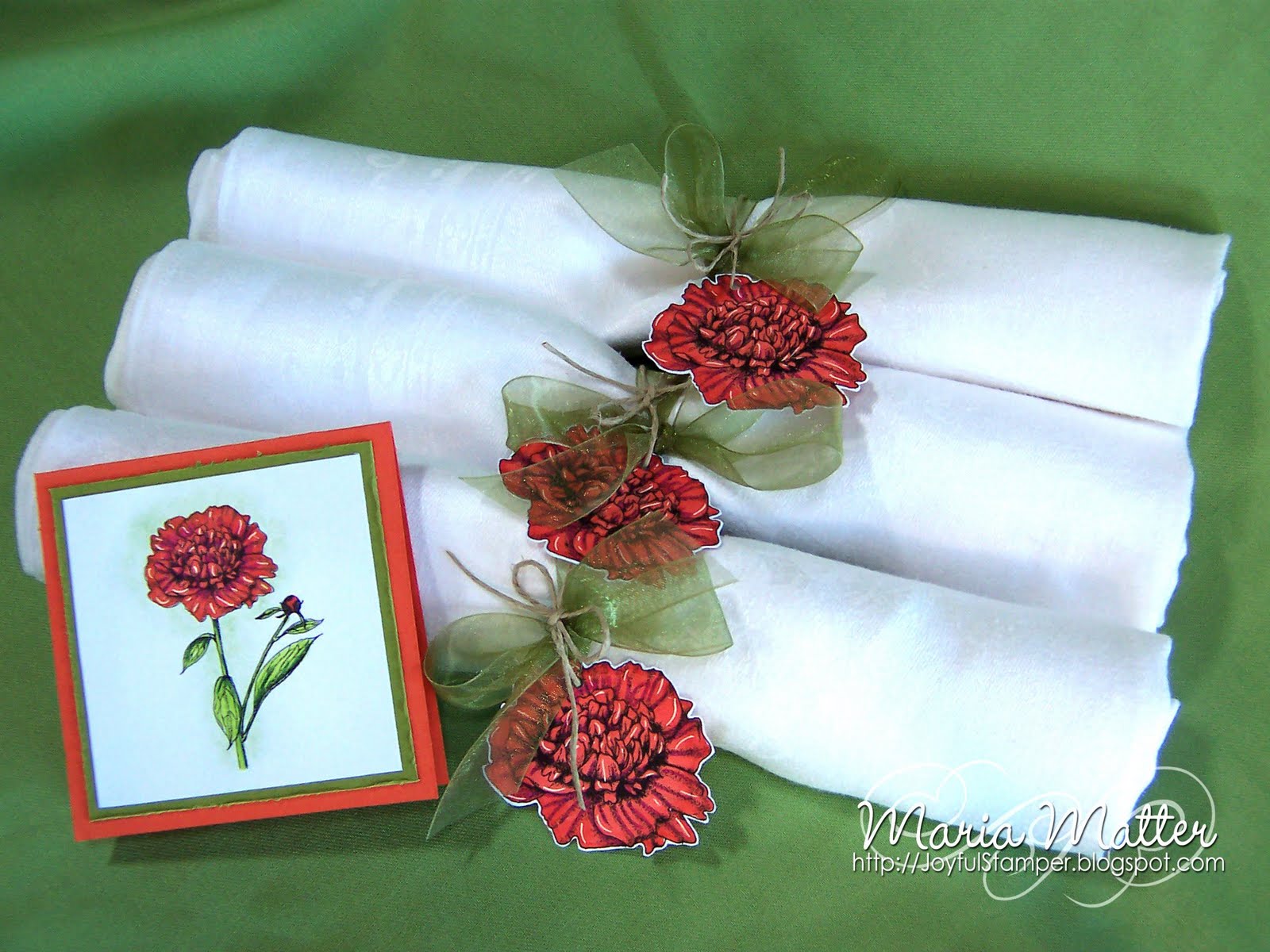 Oh Maria these napkins look sensational beautifully decorated those flowers and the green ribbon look beautiful.